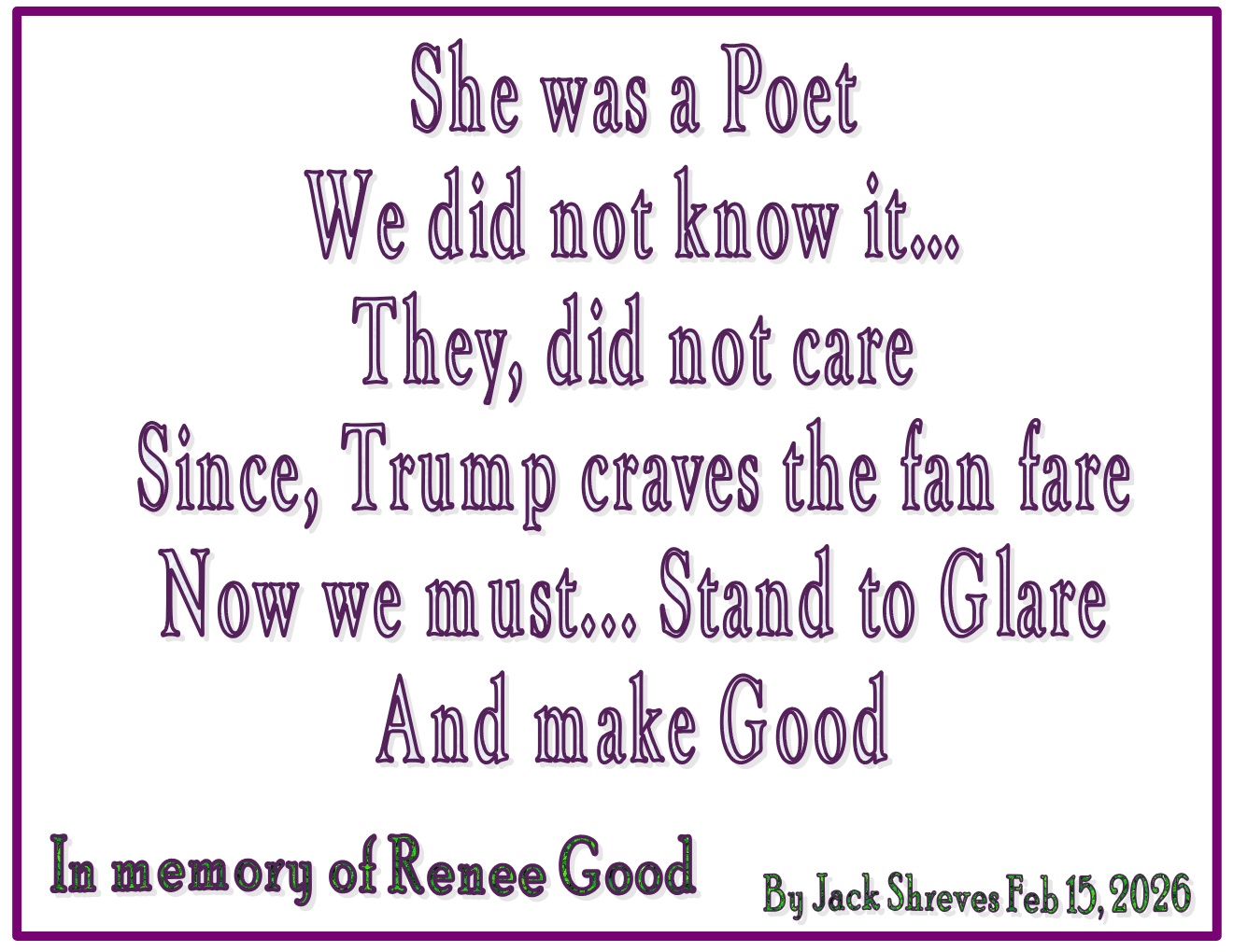 A dedication to Renee Good. A true American who died standing up for people who just want a better life for themselves and their families.